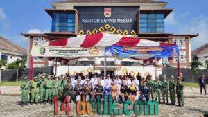 Pemerintah Kabupaten Mesuji melaksanakan upacara HUT ke-60 Provinsi Lampung, HUT ke-74 Satuan Polisi Pamong Praja dan HUT ke-62 Satuan Perlindungan Masyarakat dengan Inspektur upacara Penjabat Bupati Mesuji Sulpakar di halaman kantor Bupati Mesuji, Selasa (19/03/2024).