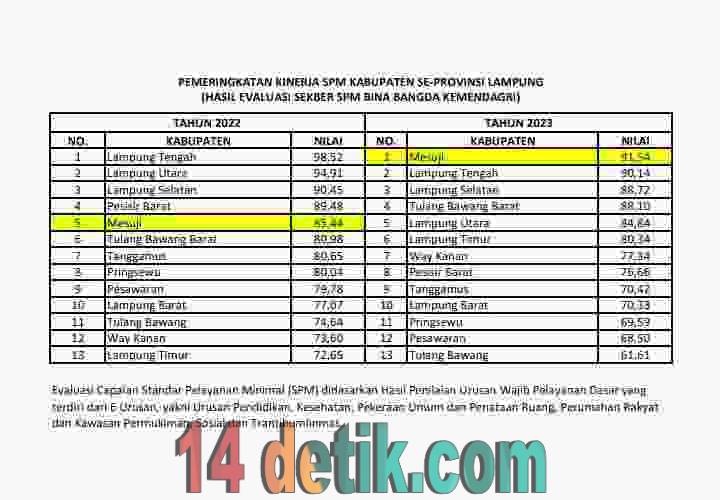 Bagaimana tidak, Kabupaten Mesuji finish di urutan pertama Standar Pelayanan Minimal (SPM) se provinsi Lampung berdasarkan Rilis Sekber SPM Permendagri Mei 2024 dengan Torehan Nilai 91,54 (Tabel Sekber SPM Kemendagri Mei 2024)