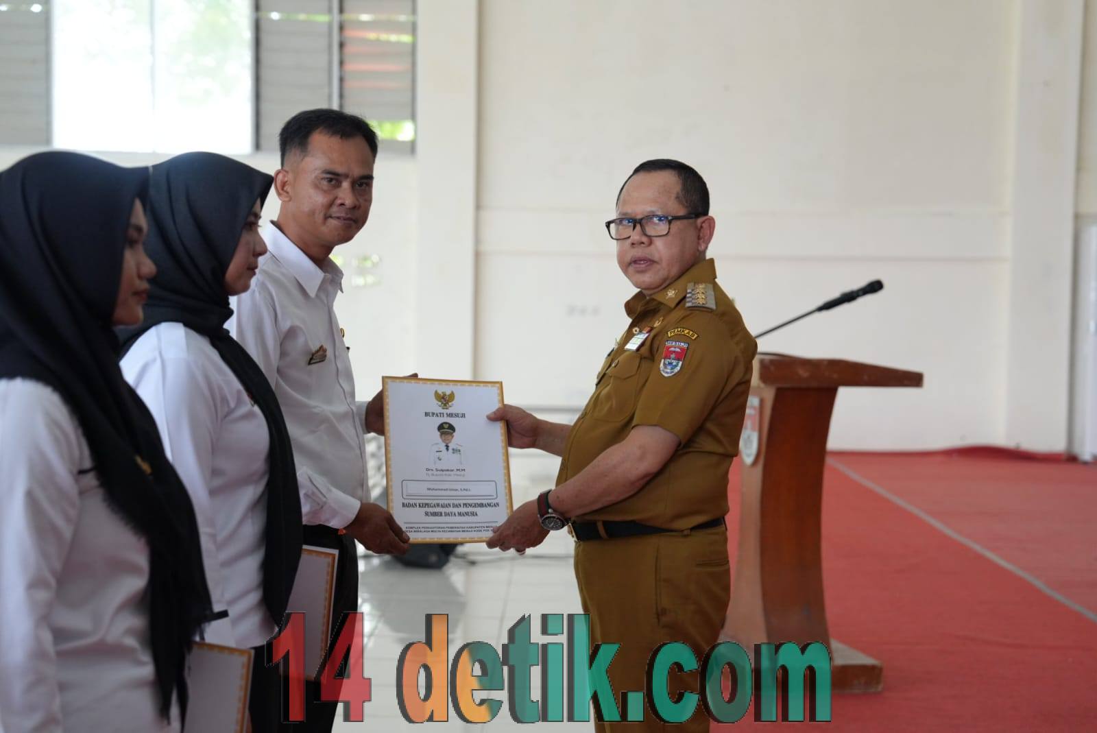 Penjabat Bupati Mesuji Sulpakar melakukan Penyerahan Surat Keputusan (SK) dan Penandatanganan Secara Simbolis Surat Perjanjian Kerja Pegawai Pemerintah Dengan Perjanjian Kerja (PPPK) Kabupaten Mesuji Formasi Tahun 2023, di Gedung Serba Guna, Taman Keanekaragaman Hayati, Kecamatan Tanjung Raya, Selasa (14/05/2024).
