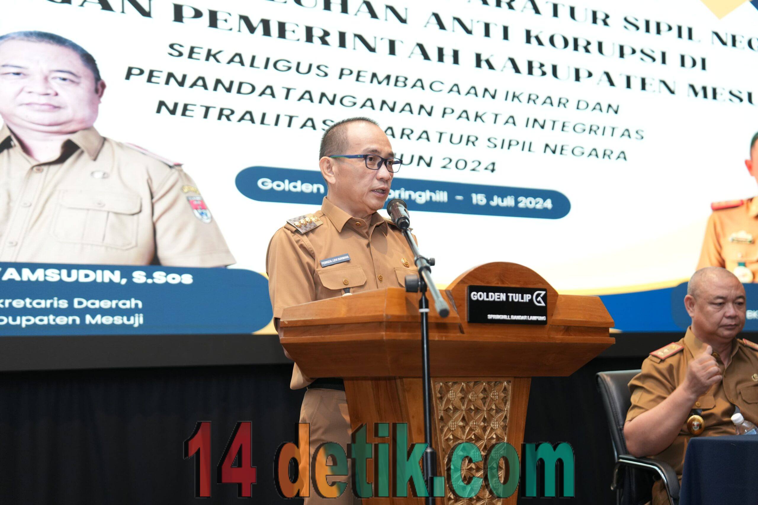 Penjabat Bupati Mesuji Febrizal Levi Sukmana, menekankan pentingnya netralitas Aparatur Sipil Negara (ASN) dan pencegahan korupsi dalam acara “Sosialisasi Netralitas Aparatur Sipil Negara dan Penyuluhan Anti Korupsi” di lingkungan Pemerintah Kabupaten Mesuji yang dilaksanakan di Hotel Golden Tulip Springhill, Senin (15/07/2024).