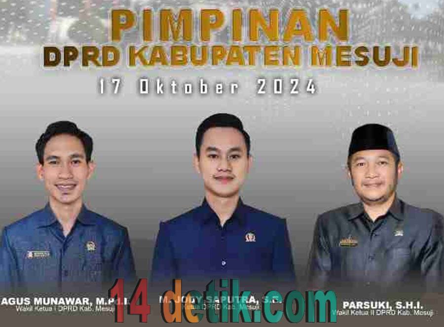 “Tanggal 10 Oktober 2024 dan Surat Gubernur Lampung Nomor: 100.1.4.2/5179/01/2024 Perihal Penyampaian Keputusan Gubernur Lampung Tanggal 11 Oktober 2024 yang menyatakan bahwa Pimpinan Dewan Perwakilan Rakyat Daerah Kabupaten Mesuji masa jabatan 2024-2029 yaitu, Muhamad Jody Safutra, S.E. Fraksi Nasdem sebagai Ketua DPRD, Agus Munawar, M.Pd.I Fraksi PKB sebagai Wakil Ketua I DPRD, dan Parsuki, S.Hi Fraksi Golkar sebagai Wakil Ketua II DPRD,” katanya, Kamis (17/10/2024).